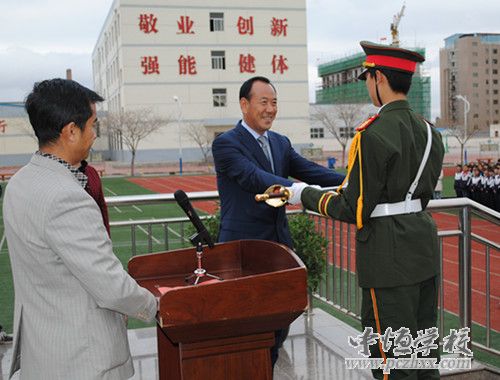 董事长房忠将珍藏多年的北京天安门国旗班升旗指挥刀授予学校国旗班班长