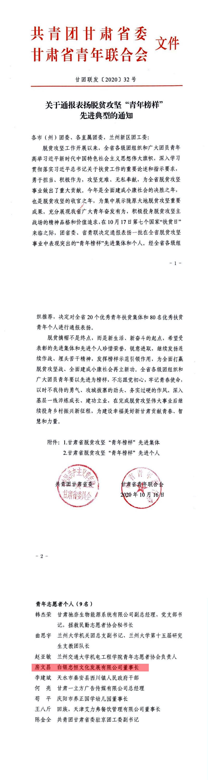 在10月17日第七个国家“扶贫日”来临之际,,,,,团省委、省青联决议对全省20个优异青年扶贫整体和80名优异扶贫青年小我私家举行转达表扬。。。其中,,,,,白银市4人入选甘肃省脱贫攻坚“青年模范”先进小我私家,,,,,他们划分是: